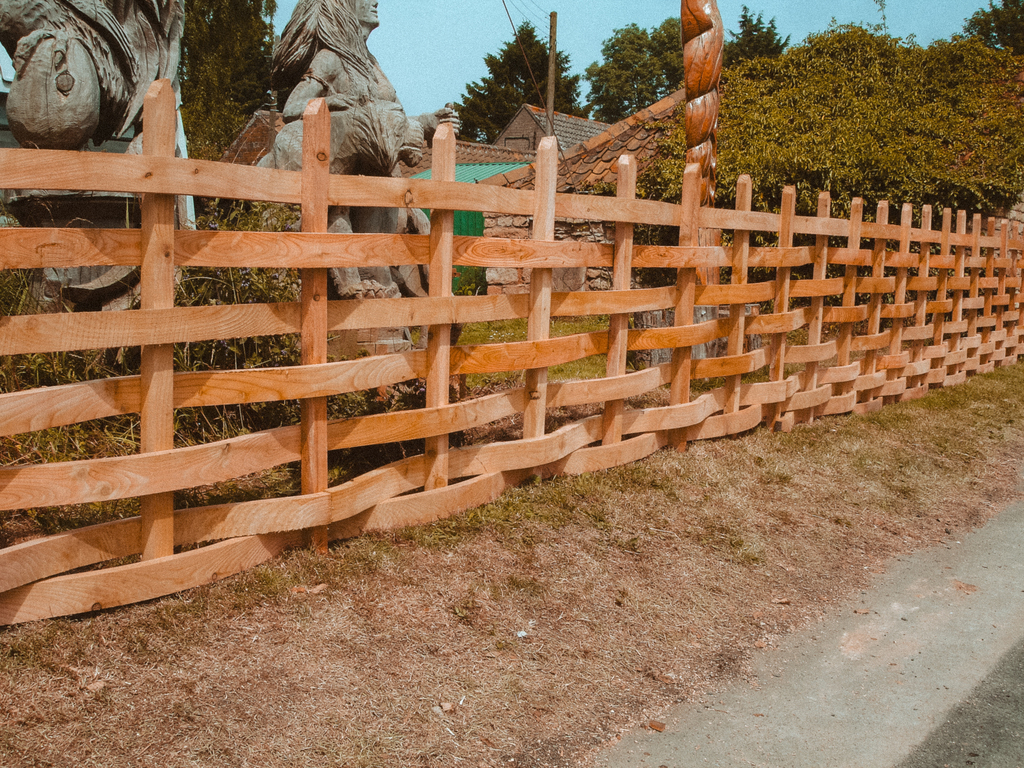 Here we have a typical example of a horizontal, close weave, woven fence. The upright posts are their maximum cross section of 75x50mm spaced 500mm apart. The horizontal rails are 75x30mm and are woven in such a way as to hide the joins at the back side of the fence, thus giving the appearance of a continuously woven face made up of rails that span the full fence length. The width of the horizontal rails can be varied, for example they could have been 50x30mm rather than 75x30mm. The distance between uprights cannot, due to having to conform to the wavelength of the horizontal rails.